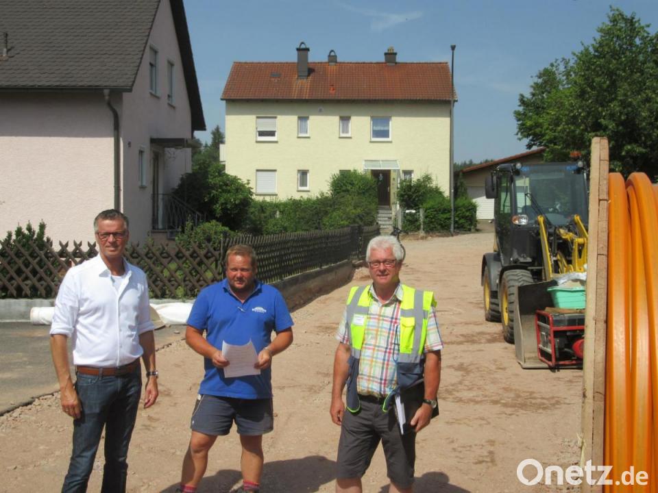 Bürgermeister Hermann Falk zeigte sich vor Ort mit Polier Christian Wallner von der Baufirma Sommer und Erhard Obendorfer von Seuss-Ingenieure, die als Planer den Bau betreuen, sehr zufrieden mit dem Baufortschritt. Viel Lob zollte Falk den Anliegern für ihr Verständnis. Schließlich müssen sie mit ungewohnten Einschränkungen zurecht kommen. Viele Hausbesitzer nutzen aber die Erneuerung der Wasserleitungen die derzeit läuft, um gleich ihren Hausanschluss auf den neuesten Stand zu bringen. Gleichzeitig werden sogenannte Speed-Pipe-Rohre verlegt. Sollte irgendwann einmal der Breitbandausbau kommen, dann braucht die Straße nicht erneut aufgegraben werden, die Glasfaserkabel können problemlos in diese Rohre eingezogen werden.