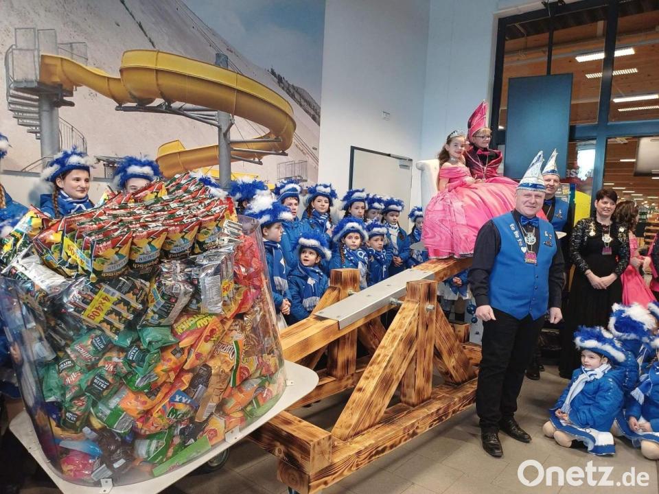 Nach dem Ehrenwalzer machte man sich dann unter der Moderation des Bayerischen Witzemeisters und Gstanzlsängers Lucky an die Wiegezeremonie. Leopold I. und Lona I. nahmen auf ihrem Sessel Platz. Von dort aus verfolgte das Faschings-Pärchen gespannt, wie die Marktmitarbeiter Sven Pflug und Bettina Dotzler zusammen mit Markt-Chef Markus Schiml die Schleckereien in den Warenkorb warfen, bis sich die Tafelwaage neigte und die Tollitäten in die Höhe hievte.