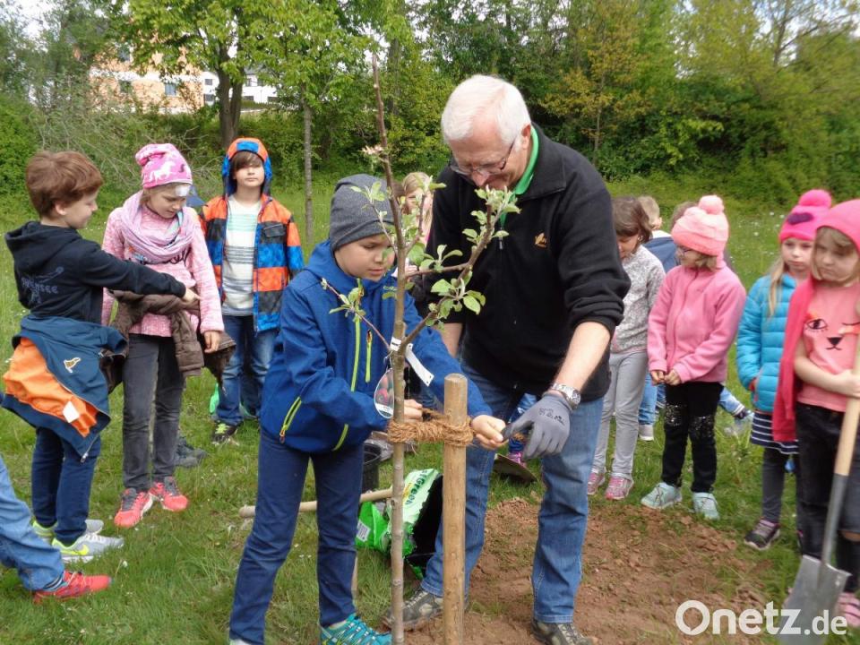 Roland Maier, Vorsitzender des Obst- und Gartenbauvereins, unterstützte die Kinder dabei. Die Wahl war auf die moderne Tafelobstsorte Carola gefallen. Bevor die Kinder sich daran machten, das Bäumchen zu pflanzen, informierte Maier über Carola: Sie liebt sonnige bis halbschattige Standorte, trägt rotgelbe, süßliche mittelgroße Äpfel, die von Mitte September bis Oktober geerntet werden können. Bis in den Dezember hinein sei das Obst geschmacklich hervorragend und saftig, so Maier.