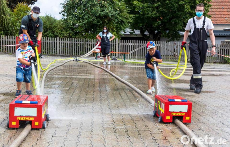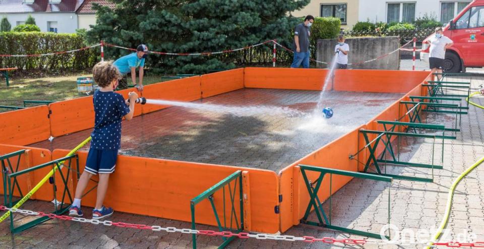 All das änderte nichts daran, dass die Kinder bei jeder Spielstation mit Feuereifer bei der Sache waren. Sie mussten sich ganz schön ins Zeug legen und viel Zielsicherheit und Kondition beim Versuch aufbringen, den Ball mit einem Wasserstrahl aus einem C-Schlauch ins gegnerische Tor zu spritzen. Zu einer Riesengaudi avancierten die spannenden Spritzenwettrennen, bei denen die hölzernen Feuerwehrautos mit einem Wasserstrahl aus einem B-Schlauch schnellstmöglich über die Ziellinie getrieben werden mussten.