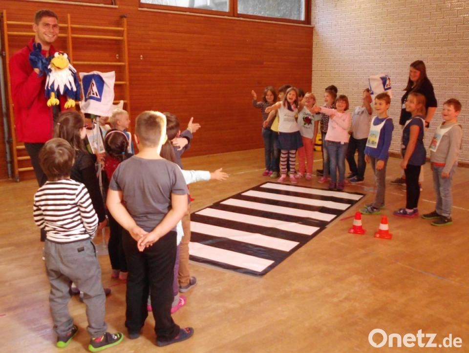 Adacus, das ist ein blaugefiederter und wissbegieriger Rabe. Ihn hatten Dagmar Mayer und Simon Halmen, zwei Verkehrstrainer des ADAC Nordbayern, in den Gymnastikraum der Hirschauer Schule mitgebracht. Denn Kinder zählen zu den besonders gefährdeten Verkehrsteilnehmern. Der Rabe Adacus verstand es bestens, den Kindern wichtige Verhaltensregeln beizubringen. Die Lehrerinnen Helga Haas, Hildegard Feyrer (beide Hirschau) und Amelie Schaller (Ehenfeld) besuchten mit ihren Kindern dieses besondere Verkehrssicherheitstraining ebenso wie die Erzieherinnen von Antonius-, Marien- und Wolfgang-Kindergarten sowie des Conrad-Kinderhauses. Adacus eroberte im Handumdrehen die Sympathien der Mädchen und Jungen. Der spaßige Vogel machte sie auf unterhaltsame Weise an extra aufgebauten Ampeln und Zebrastreifen mit den dort zu beachtenden Verkehrsregeln vertraut. Besonders intensiv wurde das Aufnehmen von Blickkontakt zwischen Fußgänger und Autofahrer geübt. „Bei Rot bleib ich steh‘n, bei Grün kann ich geh`n“, schmetterten zum Abschluss alle Kinder zusammen voller Begeisterung. „Handzeichen am Fußgängerüberweg geben wir jetzt immer", versprachen die Kinder dem spaßigen Vogel, der ihnen zur Erinnerung an das Verkehrssicherheitstraining Aufkleber und Urkunden überreichte.