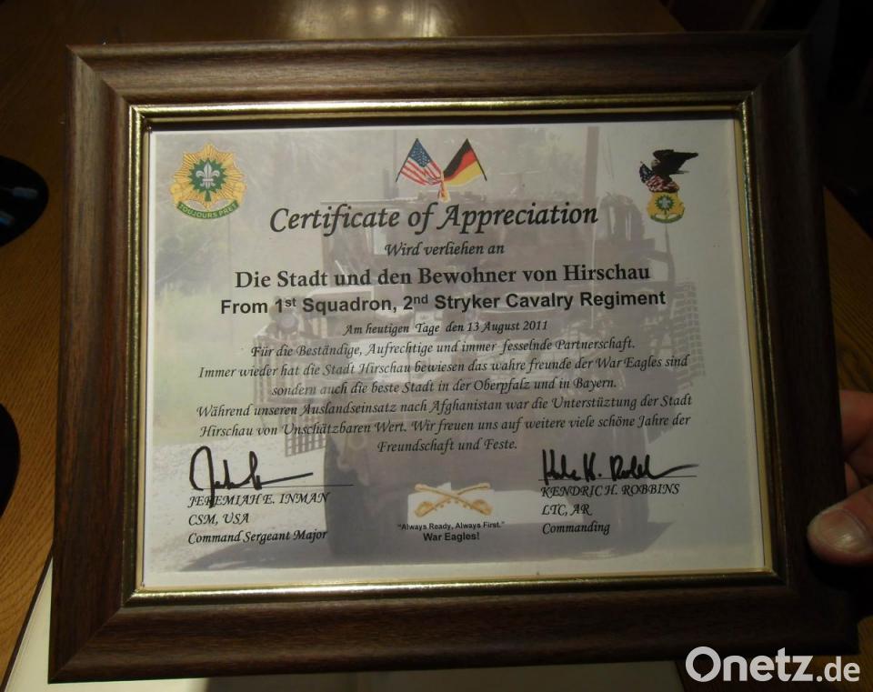 Anlass ist das zehnjährige Bestehen der „ständigen Beziehung zwischen der 1st Squadron des 2nd Stryker Cavalry Regiments und der Stadt Hirschau“. So steht es auf der Urkunde, die der damalige Bataillonskommandeur Douglas Sims am 8. August 2009 dem damaligen Bürgermeister Hans Drexler bei einem Empfang im Rathaussaal überreichte. Die Partnerschaft wurde anschließend beim 35. Markplatzfest des Musikzugs gleich mit Leben erfüllt. Erstmals in der Festgeschichte zapfte nicht der Bürgermeister das erste Fass Festbier an, das übernahm Sims.