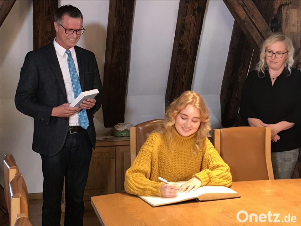 Eine so begabte junge Frau, die dann auch gleich mit einem Preis ausgezeichnet wird, ist nach Ansicht von Bürgermeister Hermann Falk etwas ganz Besonderes. Deswegen durfte sich die junge Autorin ins Goldene Buch der Stadt Hirschau eintragen, was natürlich nicht nur sie, sondern auch ihre Eltern und ihren kleinen Bruder ganz besonders stolz macht. Denn immerhin haben sich hier schon solch bekannte Größen wie der Nordische Kombinierer und Olympiasieger Eric Frenzel oder Finanzminister Albert Füracker verewigt.