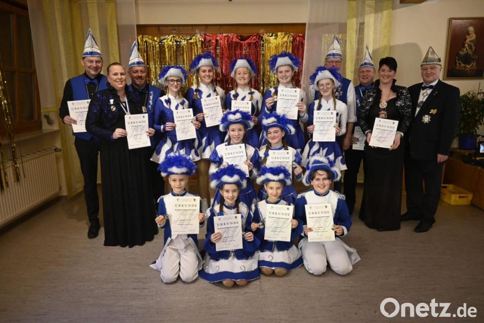 Ganz oben auf der Liste stand die Präsidentin Regina Merkl. Sie erhielt für ihre herausragenden Verdienste das Gardeleistungsabzeichen in Gold mit Stein und der Zahl 15. Das Gardeleistungsabzeichen in Bronze erhielten Janina Kuhr und Benedikt Kustner, in Silber Mara Wiesner, Jan Maier und Maya Lang, in Gold Vizepräsidentin Michaela Meier, in Gold mit Stein Marie Merkl, Melina Merkl, Maria Graf, Emilia Waldhauser, Annika Scheffler, Lea Gebel, Marie Meier und Marie Luise Neuberger. Die Ehrenspange in Bronze gab es für Elferrat Mario Gärtner, in Silber für die Elferräte Markus Meier, Christian Kellner und Martin Merkl. Für ihre besonderen Verdienste wurden Michaela Meier und Martin Merkl mit dem Ehrenorden des Landesverbands ausgezeichnet. Etwas Wehmut mischte sich in die Freude, als Enders verriet, dass er zum letzten Mal in offizieller Funktion für den Landesverband Ostbayern nach Hirschau gekommen sei. Bei der Narrhalla hätten ihn das Engagement und die Leidenschaft für das Faschingsbrauchtum stets begeistert. Ähnlich lobend äußerte sich Bürgermeister Hermann Falk. Die Narrhalla sei eine wertvolle Bereicherung für das Hirschauer Vereinsleben.