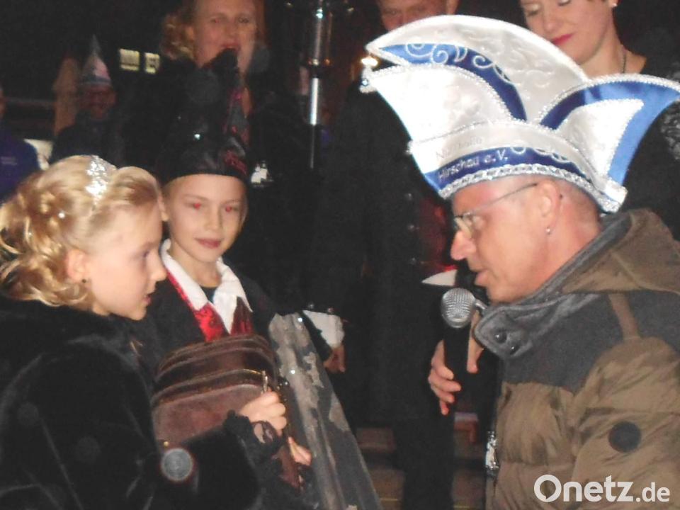 Zur Inthronisation überreichten sich die Prinzen beziehungsweise Prinzessinnen gegenseitig die Orden. Präsidentin Regina Merkl wurde von Prinz Benedikt I. mit einem solchen bedacht, die Hofdamen von Prinz Markus I., die Elferräte von Prinzessin Michaela I. und Bürgermeister Hermann Falk von Prinzessin Janina I.. Das Stadtoberhaupt zeigte sich beeindruckt von Merkls Engagement. Ohne sie wäre der Hirschauer Fasching wohl kaum wieder erwacht, sagte er. Merkls zartes Pflänzchen Kindergarde habe sich seit 2014 prächtig entwickelt. Das Herausrücken des Rathausschlüssels und der Stadtkasse "mit einem bissl Geld" an Prinz Benedikt I. fiel Falk nicht allzu schwer. Launig bot er dem Kinderprinzenpaar an, ab Montag in seinem Arbeitszimmer im Rathaus die Geschäfte zu übernehmen.