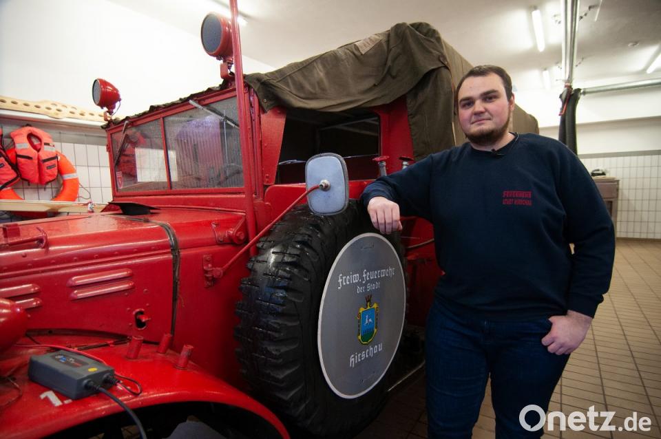 Leuchtend rot steht das erste Motorlöschfahrzeug der Hirschauer Feuerwehr in der Fahrzeughalle: Ein Dodge Chrysler, Baujahr 1944, aus US-Militärbestand. Alt, aber gut gepflegt. Denn 2017 machten es sich einige Mitglieder zur Aufgabe, das Fahrzeug wieder herzurichten. Einer der Tüftler ist Jugendwart Nico Schuminetz: "Wir fanden es schade, das Fahrzeug nur in der Halle stehen zu lassen." Seit der Restauration kommt es bei besonderen Anlässen zum Einsatz. Bei Festzügen zum Beispiel - oder wenn das Onetz-Team mit der Kamera für eine Spritztour vorbeischaut.