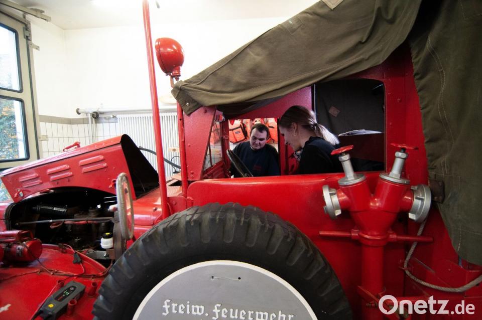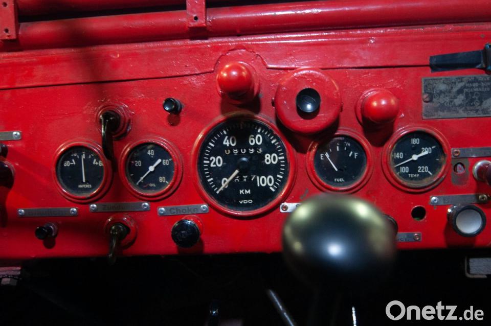 Um das Fahrzeug vom Fleck zu bekommen, braucht es etwas Übung. Standgas, Zwischengas. In engen Kurven muss Nico Schuminetz kräftig am Lenkrad kurbeln. "Bei Festzügen machen wir das zu zweit." Als Hilfestellung sind die meisten Hebel und Knöpfe am Armaturenbrett beschriftet: "Blaulicht", "Zündung", "Choke". "Es hat eine Weile gedauert, bis wir das alles rausgefunden haben", erzählt der Jugendwart.