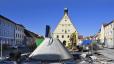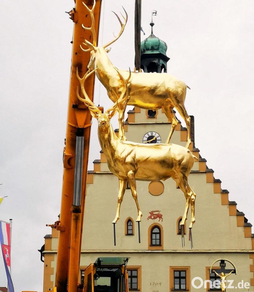 Am Dienstag musste nun zunächst Maß genommen werden, damit die Bohrlöcher auch an der richtigen Stelle entstehen konnten. Das Bohren dauerte mehrere Stunden und so lange hingen die 250 Kilogramm schweren Hirsche am Haken des Krans. Viele Zuschauer, die vorbeikamen, blieben stehen, zückten ihr Handy und hielten diesen einmaligen Vorgang im Bild fest. Der Brunnen ist damit noch nicht ganz fertiggestellt. Mit der Fertigstellung des Brunnens, dem Goldenen Band an der Kirche und dem gebrochenen Rad in der unteren Stadt sind dann alle drei Kunstwerke im Zuge der Stadterneuerung abgeschlossen.