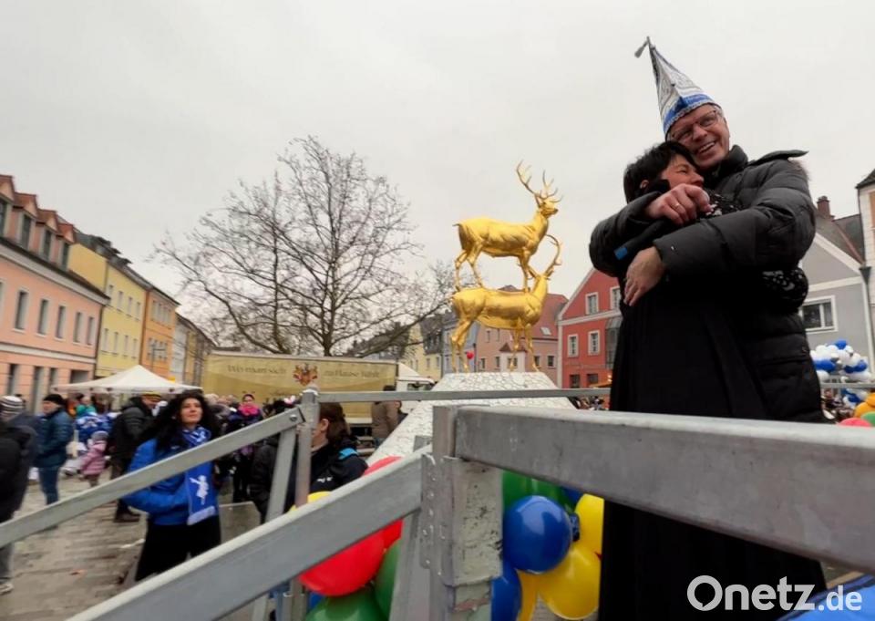 Die Kinderfeuerwehr präsentierte sich einsatzbereit und die Anglerjugend war in Fischgewändern dabei. Und damit man so einen anstrengenden Faschingszug auch körperlich durchhält, warb die Gruppe um Gertrud Siegert plakativ wie musikalisch für eine bayerische Brotzeit. Auf der Marktplatzbühne moderierte Bürgermeister Hermann Falk, unterstützt von Präsidentin Regina Merkl, das närrische Geschehen und stellte humorvoll die vorbeimarschierenden Gruppen vor. Schlusspunkt des Umzugs war dieses Mal die Hirschengasse. Von dort aus machten sich die allermeisten sofort auf in die Georg-Schiffer-Straße zum Apotheker-Eck, dem Startpunkt für die Weltrekordpolonaise. Man wollte ja mithelfen, dass Hirschau Weltrekord-Stadt wird.