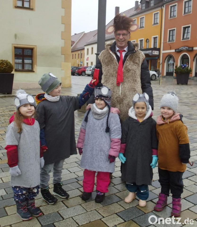 Wie es sich für den Fasching gehört, machten sie sich natürlich nicht „in Zivil“ auf den Weg. Nein! Ihrem Faschingsmotto „Das Dschungelbuch“ folgend marschierten sie, kostümiert als Bären, Panther, Tiger, Affen und Elefanten, in Richtung Marktplatz. Dort stimmte die Kinderschar lautstark Faschingslieder an. Den Kinderlärm konnte auch Bürgermeister Hermann Falk in seinem Amtszimmer nicht überhören. Mit Riesenschritten sprintete er auf den Marktplatz und begrüßte die kleinen Maschkerer – wohl ahnend, was ihm gleich blühen würde. Die kleine Crina und der kleine Henry schritten gleich zur Tat, zückten ihre Schere und schnitten dem Stadtoberhaupt kurzerhand die schmucke Krawatte ab. Der leistete natürlich keine Gegenwehr. Doch damit war es nicht getan: Dem Bürgermeister wurde ein Affenfell angezogen und eine Krone aufgesetzt, lautstark begleitet von den Rufen „King Louie oho, King Louis oho“. Bürgermeister Falk fühlte sich pudelwohl in seiner Rolle als Affenkönig. Er tanzte mit den Dschungelkindern den „Rucki Zucki“, den „Ice-Age-Side-Shuffle“ und Donikkls Fliegerlied „So a schöner Tag!“ Nach einer reichlichen Gummibärchen-Spende durfte der Rathauschef wieder zurück an die Arbeit.