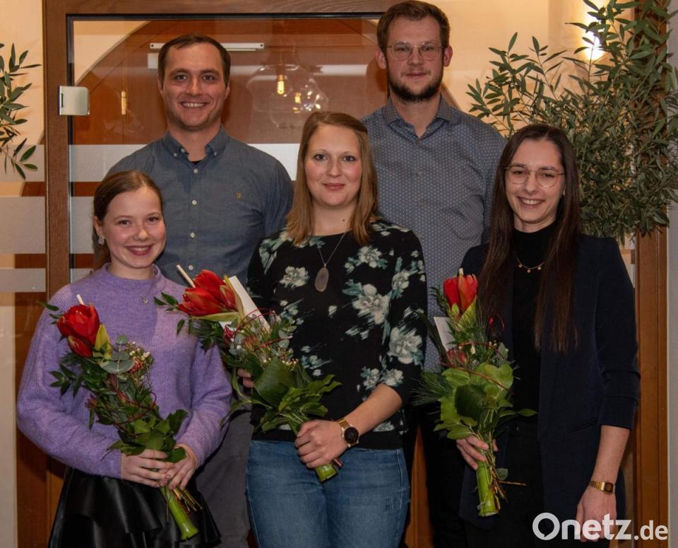 Vorsitzender Maximilian Stein und sein Stellvertreter Erik Remhof nahmen die konstante Aufwärtsentwicklung der Majorettengruppe und die bestandenen Grad-Prüfungen zum Anlass, den Trainerinnen Marie Giehrl und Katharina Stein sowie Lilli Pfab zu den bestandenen Examen zu gratulieren und für die engagierte und qualifizierte Trainings- und Ausbildungsarbeit zu danken. Dafür gab es für das Trio Blumensträuße. Dank gab es für die fleißige und erfolgreiche Werbung um neue Mitglieder für die Majorettengruppe. Im Verlauf des vergangenen Jahres kamen sechs Neulinge hin, so dass die Gruppe jetzt 16 Mitglieder hat. Von ihnen haben zwischenzeitlich sechs den Grad 6 erreicht, vier den Grad 5, drei den Grad 4 und drei den Grad 3.