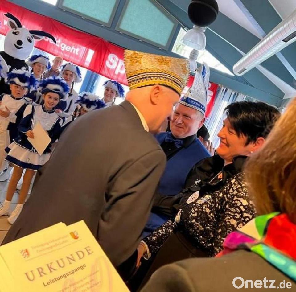 Fünf Stunden lang waren der Schlachtruf „Hirschau oho“ und ausgelassene Stimmung im Sportpark Trumpf. Zur Freude von Präsidentin Regina Merkl waren mit Ela Bierler und Manfred Enders zwei Vertreter des Landesverbandes Ostbayern zu der Sause gekommen. Enders hatte jede Menge Arbeit zu leisten. Da Corona-bedingt 2020 und 2021 keine Ehrungen vollzogen werden konnten, hatte er nicht weniger als 35 Auszeichnungen vorzunehmen. Für die Gardemitglieder gab es Abzeichen, für die Hofdamen und Elferräte Spangen. Ganz oben auf der Liste der zu Ehrenden: Regina Merkl. Sie erhielt das Gardeleistungsabzeichen in Gold mit Stein und der Zahl 12.