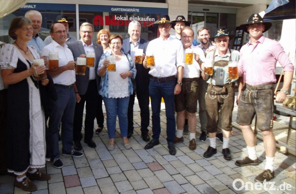 Zahlreiche lokale Prominenz kam zur Eröffnung des 45. Marktplatzfestes und stieß mit LTC Timothy Wright (rechts) auf das Gelingen des Festes an: Landrat Richard Reisinger (Siebter von links), Ex-MdL Reinhold Strobl (Zweiter von links), Bezirksrat Martin Preuß (Fünfter von links), Bürgermeister Hermann Falk (Sechster von rechts), Zweiter Bürgermeister Josef Birner (Dritter von links), Musikzug-Vorsitzender Maximilian Stein (Fünfter von rechts), sein Stellvertreter Thomas Stark (Dritter von rechts), NBMB-Kreisvorsitzender Werner Stein (Vieter von links), Brauerei-Chef Franz Dorfner (Zweiter von rechts) und die Stadtratsmitglieder Hans-Jürgen Schönberger (Vierter von rechts), Bärbel Birner (Siebte von links), Kerstin Ackermann (Sechste von links) und Johanna Erras-Dorfner (links.).