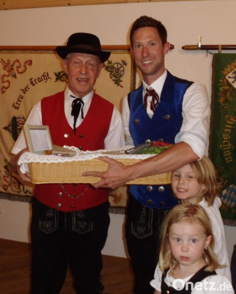 In der Reihe der Gratulanten durfte das Patenkind der Hirschauer Trachtler, der Heimat- und Volkstumsverein Ehenbachtaler aus Schnaittenbach, nicht fehlen. Traditionsbewusst übergab Vorsitzender Erwin Meier als Geschenk einen Korb mit Brot und Salz, ein Präsent, das für Sesshaftigkeit und Gemeinschaft stehe. Sichtlich bewegt war das einzig noch lebende Gründungsmitglied der Hirschauer Trachtler, der Ehrenvorsitzende Emil Englhard. Der 97-Jährige gestand: „Dass ich des nu daleb, dass mir a so a schöins Heim hob’n, hätt‘ i nimma g’laubt.“