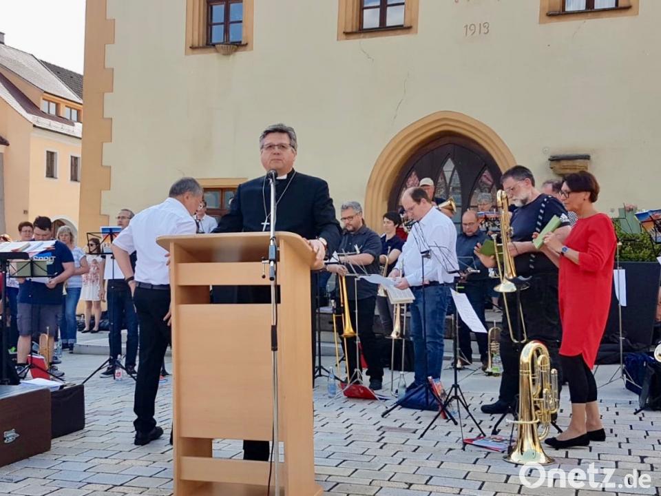 Schötz verwies auf die biblische Überlieferung, dass Posaunen Mauern zum Einsturz brachten, und versicherte dem Bürgermeister, dieses Mal würden die alten Mauern stehen bleiben. Es sei die Musik, die verbinde, Brücken baue und es schaffe, verschiedenste Menschen zusammenzubringen. "Wenn, dann fallen heute Mauern in den Herzen." Schötz sprach von einer Vision, die er für die Kirche hegt: "Kirche soll offen sein, dort hingehen, wo die Menschen sind, und sich nicht hinter Mauern verschanzen." Nach einem gemeinsamen Vaterunser sprach Pfarrer Stefan Fischer den Segen, der Chor stimmte als Schlussstück in das Lob Gottes ein: " Gloria sei dir gesungen".