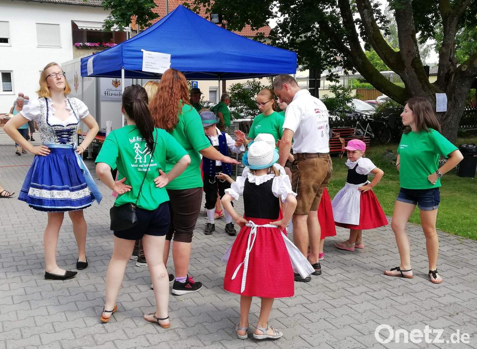 (u) Die Veranstaltung lief sehr gut an. Zur Freude des Vorsitzenden Michael Meier und seines Helferteams fanden sich schon am frühen Nachmittag zahlreiche Gäste im Biergarten des Josefshauses ein. Sie konnten nicht nur Kaffee, Kuchen, Torten oder Grillgerichte genießen, sondern sich auch an den Tanzdarbietungen erfreuen. Klein und Groß tanzten zusammen den „Hans, bleib daou“, den „Kikeriki“, den „Hans Adam“, die „Sternpolka“ und „'s Feuerhäusl“. Dass sich nicht alle im Dirndl und in der Lederhose, sondern auch im Vereins-T-Shirt auf der Tanzfläche drehten, lag daran, dass eine ganze Reihe der Tänzer auch als Bedienungen und an den Verpflegungsständen im Einsatz war.