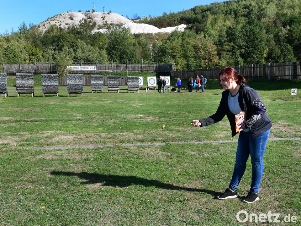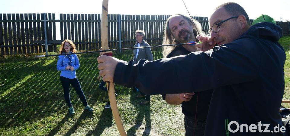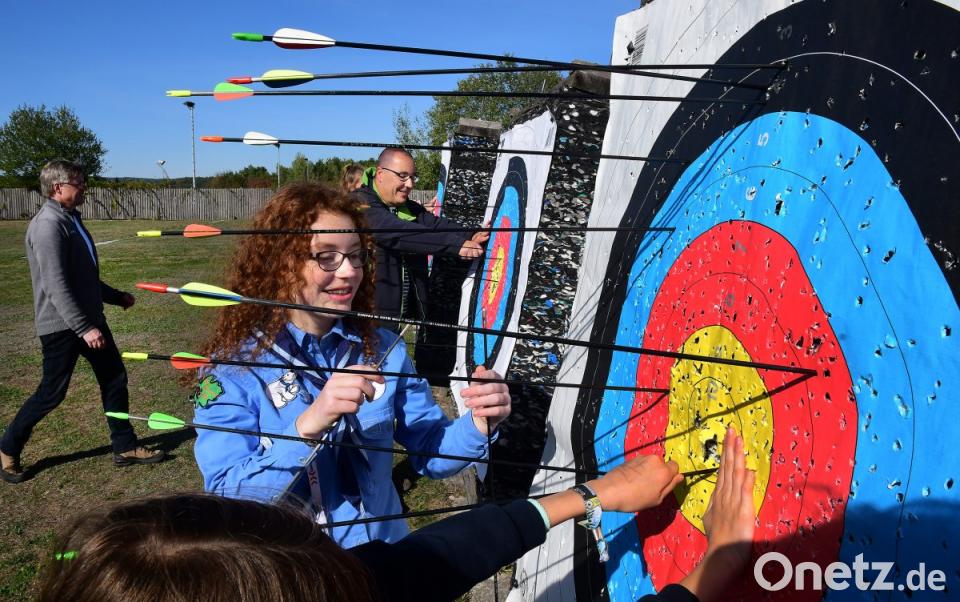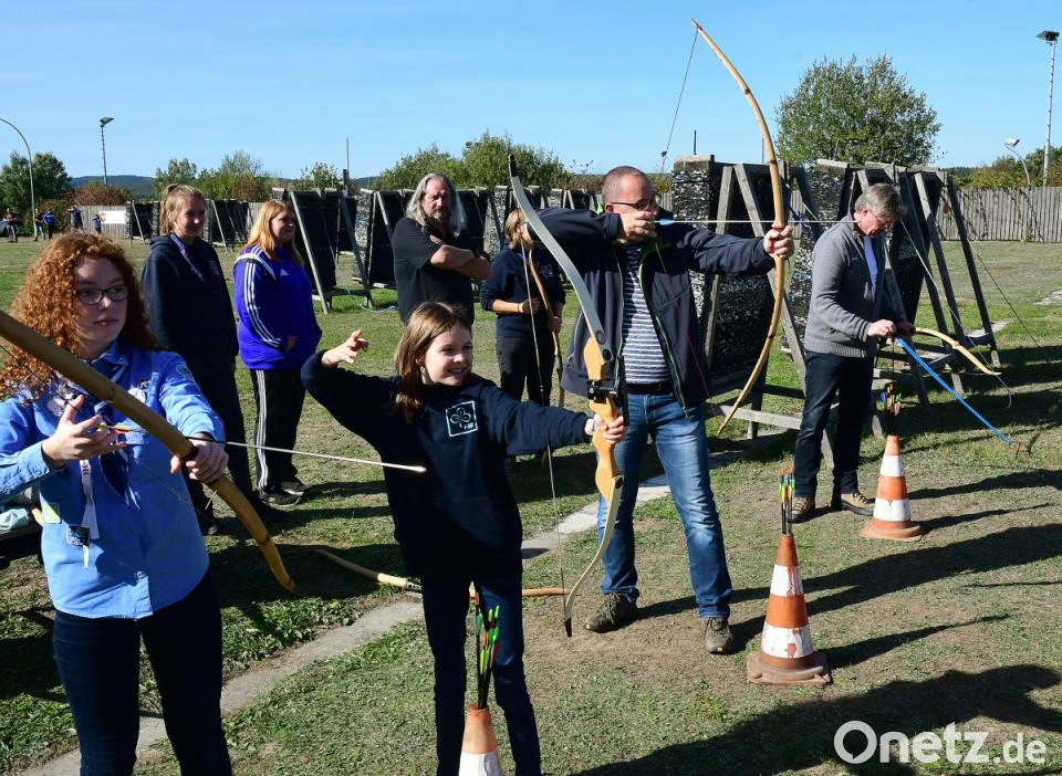 Harald Thieme, zweiter Schützenmeister der SG Diana, gibt den Töchtern und Vätern Anweisungen zum Bogenschießen. Schnell merken sie: Das ist ziemlich anstrengend. "Bogenschießen ist ja schließlich ein Sport", sagt Thieme mit einem Augenzwinkern. Selbst das richtige Pfeil-aus-der-Scheibe-Ziehen will gelernt sein. Nach ein paar Mal üben trifft der erste ins "Gold". Auf diese Bezeichnung des gelbfarbenen Mittelkreises legt Thieme besonderen Wert. Auch die Pfadfinderinnen versuchen sich mit Pfeil und Bogen.