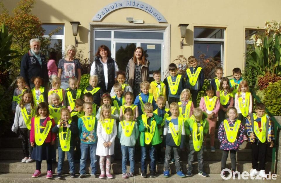 Die Kreisverkehrswacht stattet die 40 Abc-Schützen der Hirschauer Grundschule mit reflektierenden Sicherheitsüberwürfen aus, damit sie auch bei Dunkelheit und Nebel sicher zur Schule und wieder nach Hause kommen (hinten, von links): Verkehrswachtvorsitzender Hubert Ritz, Studienrätin Hildegard Feyrer, Rektorin Birgit Härtl und Lehrerin Ramona Ruppert.