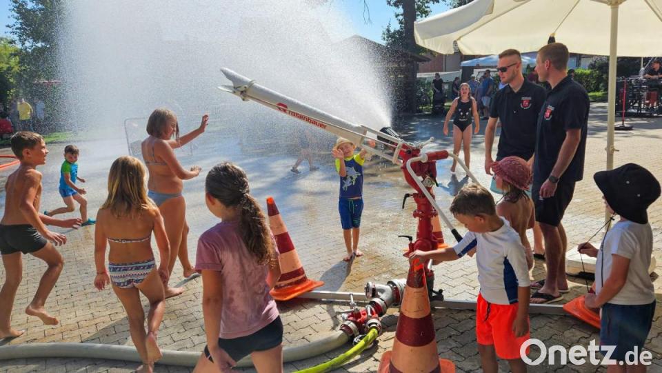 Heiß begehrt war bei den Kindern das Spritzen mit dem großen Wasserwerfer. Bis zu 80 Meter weit könnte man mit ihm spritzen. Auf Sprühstrahl eingestellt sorgte er für einen mächtigen Sprühnebel, der angesichts der hohen Temperaturen für eine sehr willkommene Erfrischung sorgte. Mit im Bild die beiden Aufsichten Marco Schuminetz (r.) und Florian Pawluk (l.).