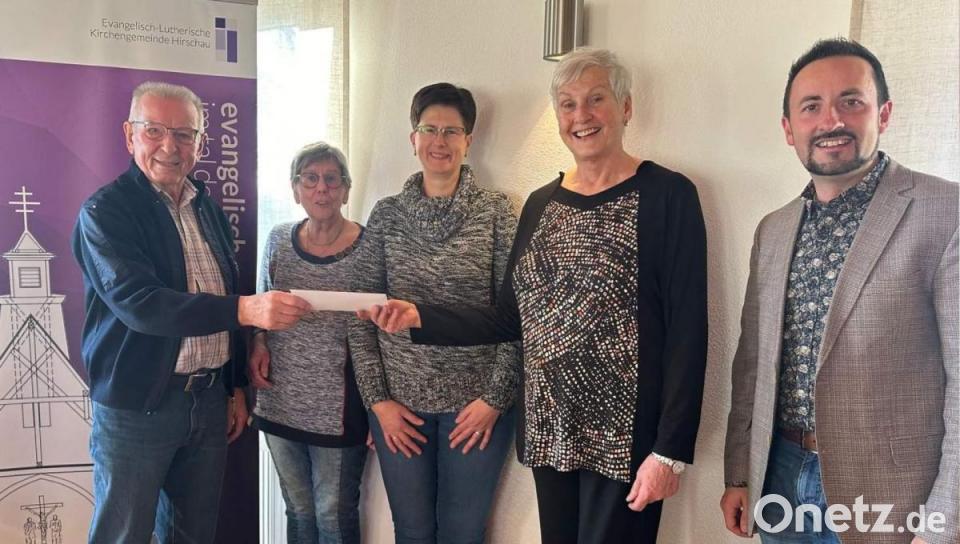 Zur Unterstützung der Arbeit des evangelischen Seniorenkreises übergibt Stadtrat Rudi Wild einen 300-Euro-Scheck der Stadt Hirschau (von links): Stadtrat Rudi Wild, stellvertretende Seniorenkreisleiterin Gabriele Heuberger, Stadträtin Hildegard Gebhardt, Seniorenkreisleiterin Ingrid Schlosser und Pfarrer Stefan R. Fischer.