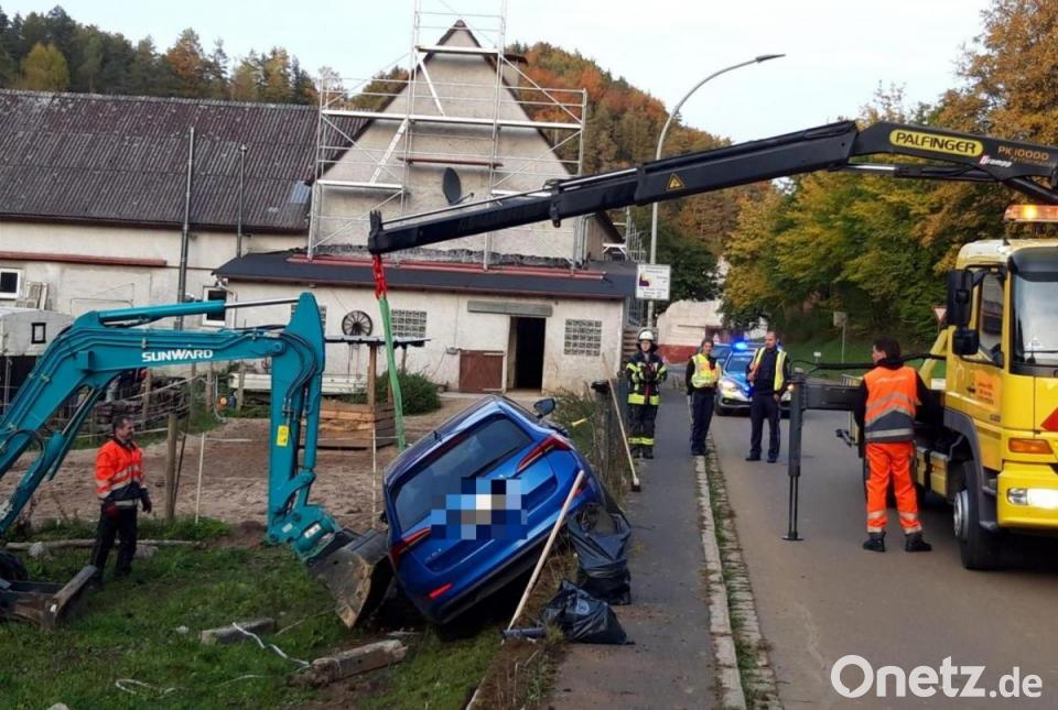 Die Frau war aus unbekannten Gründen von der Fahrbahn abgekommen, ihr Wagen überquerte die Gegenfahrbahn, fuhr über den Gehsteig und auch über sechs Betonpfeiler einer angrenzenden Pferdekoppel hinweg, bis er in Schieflage zum Stehen kam. Die Feuerwehr stellte den Brandschutz sicher und übernahm die Verkehrsabsicherung. Mit Hilfe eines Baggers, der zufällig am Unfallort war, wurde das Unfallauto so gesichert, dass es nicht weiter kippen konnte.
