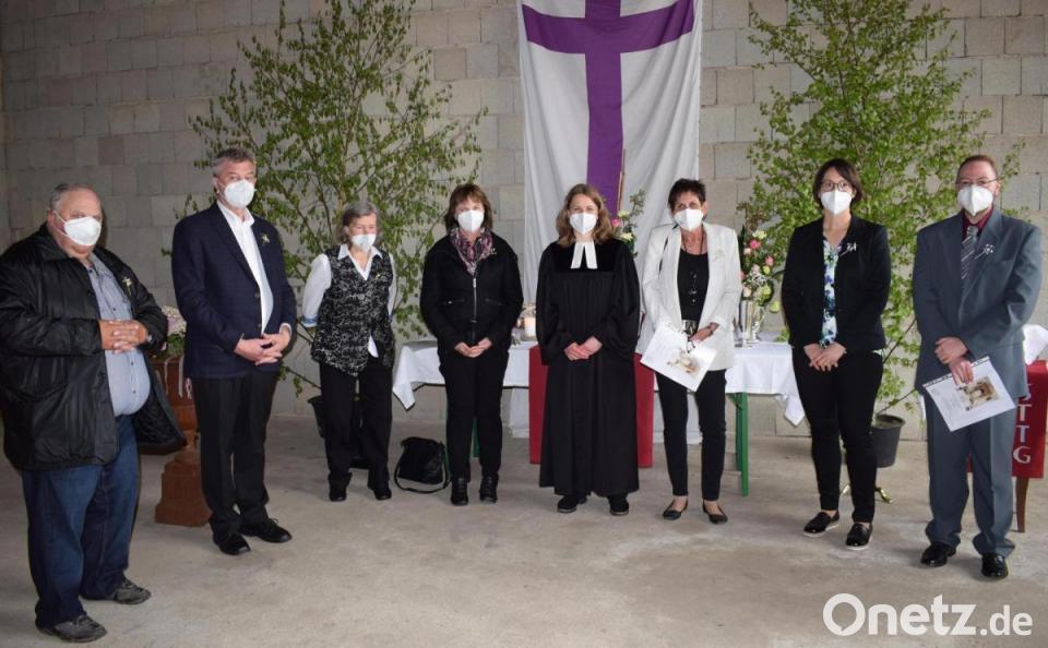 Der Kirchenvorstand hatte die Halle festlich mit Birken, Blumen und der Kirchenfahne geschmückt. Ein Ensemble des Liederkranzes unter der Leitung von Regina Rösch sowie der Posaunenchor unter der Leitung von Martina Rischan gestalteten die Feier musikalisch.