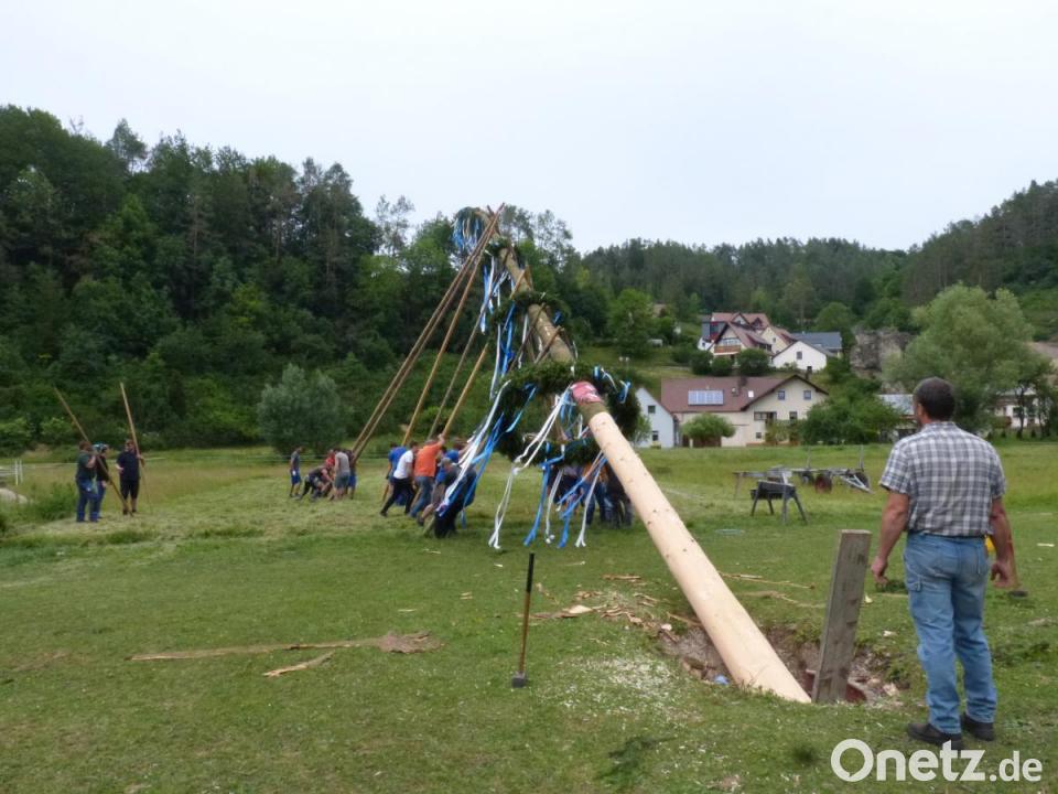 Auf dem Festplatz im Tal wurde das Kirwasymbol zum Aufstellen hergerichtet. Zu "Kapo" Jürgen Bodendörfer stießen am frühen Nachmittag die Mannsbilder aller Altersklassen und legten sich mit den Schwalben kräftig ins Zeug. Nach und nach schoben sie die 30 Meter in die Senkrechte und verkeilten sie zur erforderlichen Standfestigkeit. Seitdem flattern die weiß-blauen Bänder der Kränze im Wind.