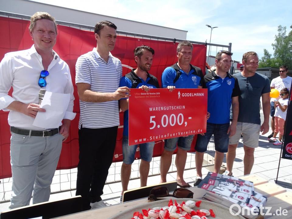 Steine für Vereine: Über 60 000 Stimmen wurden im Internet für einen Wettbewerb abgegeben, den das Unternehmen Godelmann gestartet hatte. Beim "Tag des Gartens" in Högling erhielt der SV Diendorf einen Gutschein über 5000 Euro. Dafür kann sich der Club Erzeugnisse aus dem Godelmann-Programm aussuchen. Drei Vertreter des SV Diendorf (blaue Trikots) nahmen den Gutschein entgegen. Ihn überreichten Firmenchef Bernd Godelmann (links), der neue Sportvorstand des 1. FC Nürnberg, Robert Palikuca (Zweiter von links), und der ehemalige FCN-Vertragsspieler Andy Wolf (rechts). Auf den zweiten Platz kam die DJK Ensdorf. Sie darf aus ihrem Nachwuchs eine Einlaufmannschaft bei einem Heimspiel des FC Nürnberg stellen. Für Rang drei erhielt der FC Rieden einen neuen Trikotsatz.