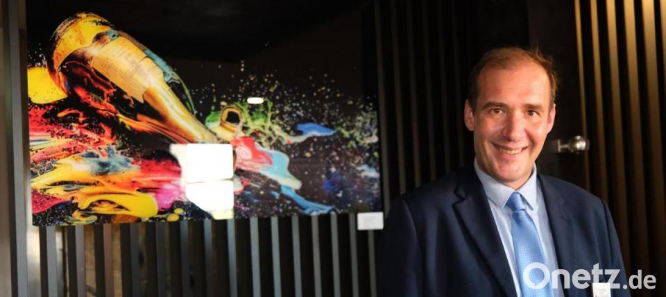 Drei dieser Werke steuert Paul-Patrick Heitzer bei. Er zeigt in seinen Bildern, wie die künstliche Intelligenz inzwischen Eingang gefunden hat in die Kunst. Champagner sprudelt aus der Flasche und verteilt sich auf einer Glasplatte. Perlend und in leuchtenden Farben. "Das Ergebnis geht in Richtung Surrealismus", erklärt der Künstler dem Betrachter. Die Verbindung einer KI-Plattform und eines Bildbearbeitungsprogramms lasse diese Motive entstehen.