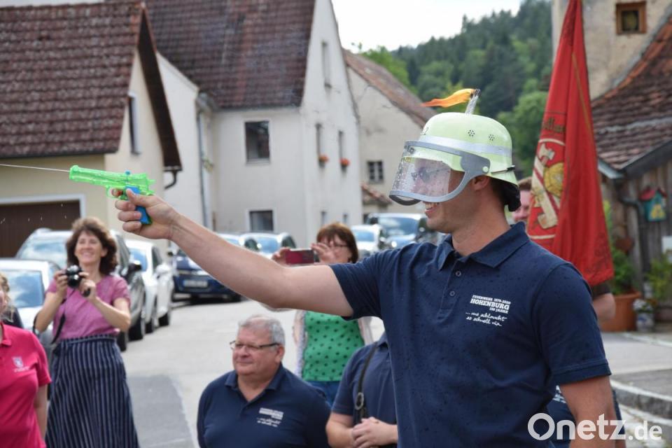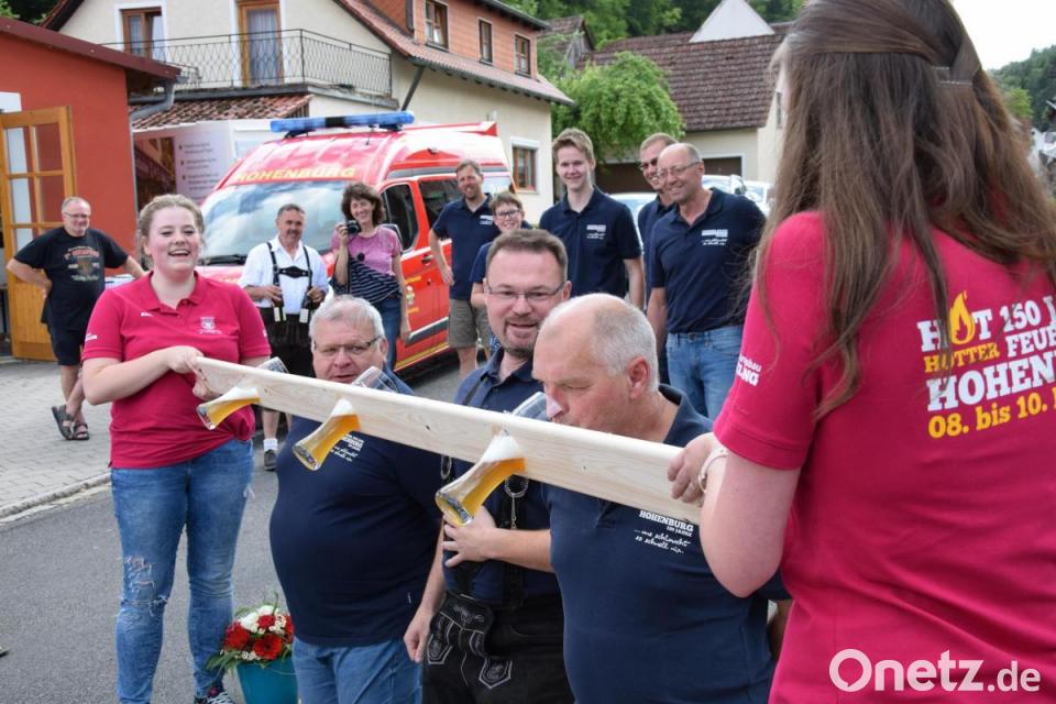Bis es freilich soweit war, dass die auserkorene Festmutter schließlich ja gesagt hat, musste die Hohenburger Feuerwehrcrew und ihr Vorsitzender Florian Junkes, Kommandant Klaus Falk und Festleiter Hubert Przybilla schon ein paar Aufgaben stemmen. Einstieg war, dass nach dem Zufallsgenerator ausgesuchte Feuerwehrleute mit brennenden Kerzen auf ihren Helmen diese gegenseitig mit Wasserpistolen auszulöschen hatten. Eine fordernde Aufgabe war für die Feuerwehrführung je eine halbe Weißbier auf einen Zug zu leeren. Die Getränke wurden ihnen von den Festdamen auf einem zwei Meter langen Brett kredenzt. Auch wenn Junkes ein wenig ins Straucheln kam, so blieb er doch noch knapp innerhalb der vorgegebenen Sollzeit, um diese Aufgabe ohne Fehlerpunkte zu meistern.
