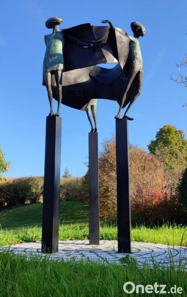 Seit Sommer lädt die von der Aschacher Bildhauerin Hanna Regina Uber gestaltete Bronze-Skulptur auf dem Gelände des Pfarrgemeindehauses zum Betrachten und – gar nicht so häufig in der Kunst – zum Schmunzeln ein. Drei bewusst nicht realistisch gestaltete Figuren verleihen auf humorvolle Art und Weise dem Ausdruck, was nicht nur zu Dorferneuerungsverfahren dazu gehört: dem zähen, mal mehr, mal weniger kontroversen Ringen in der Sache.