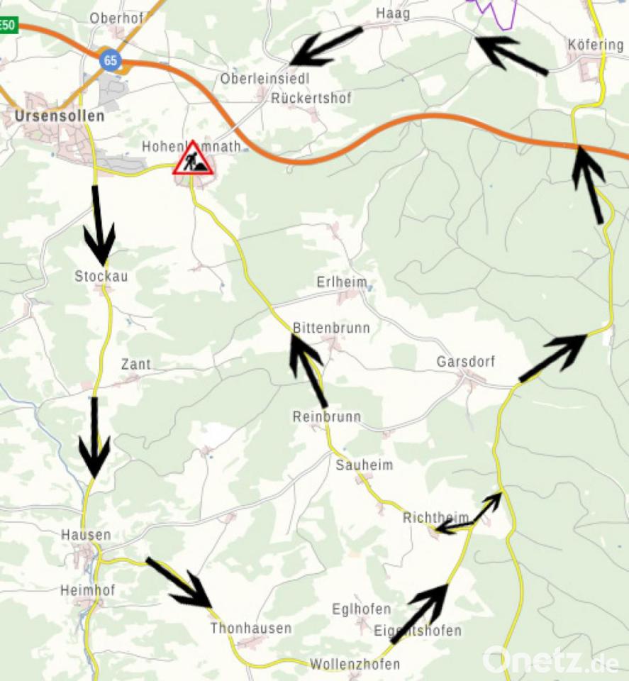 Die Umleitung führt von Ursensollen über die Kreisstraße AS 4 bis nach Hausen, von dort über die Kreisstraßen AS 28 und AS 9 nach Hohenkemnath beziehungsweise weiter über die AS 2 nach Köfering. Von dort aus kann die AS 15 bis zur Baustelle in Hohenkemnath befahren werden (Umleitung in Gegenrichtung entsprechend).