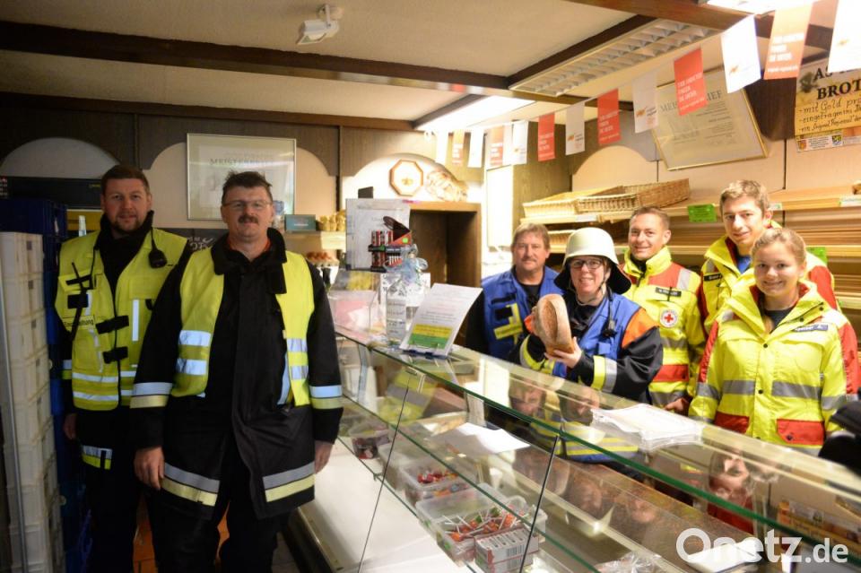 Bäckerei Wenkmann Inhaberin Ruth Herbst (Mitte) startet zum 70-jährigen Firmenjubiläum eine Spendenaktion für die Feuerwehr Hohenkemnath und die Helfer vor Ort Ursensollen. Für jedes verkaufte Roggo Roggenbrot spendet die Bäckerei 50 Cent, darüber hinaus können Spenden in die Spendenflasche in der Bäckerei geworfen werden. Zusammen mit den Hohenkemnather Feuerwehrlern und den Helfern vor Ort wurde die Aktion mit einer gemeinsamen Übung gestartet.