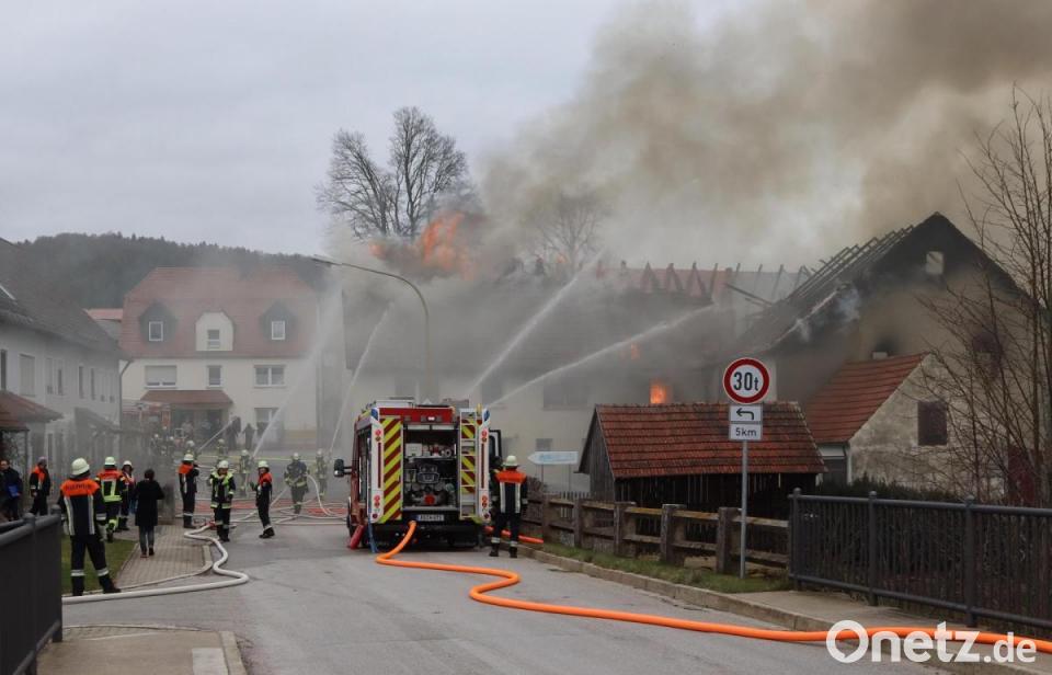 In der Ortsmitte von Holnstein, einer zur Gemeinde Neukirchen bei Sulzbach-Rosenberg gehörenden Ortschaft, war es am Mittwoch zu einem Großbrand gekommen. Anwohner hatten in den Mittagsstunden im Dachstuhl eines Mehrfamilienhauses mit Stallungen Rauch und Flammen bemerkt und die Rettungskräfte verständigt. Als diese eintrafen, stand der Dachstuhl von zwei Flügeln des Gebäudes bereits im Vollbrand.