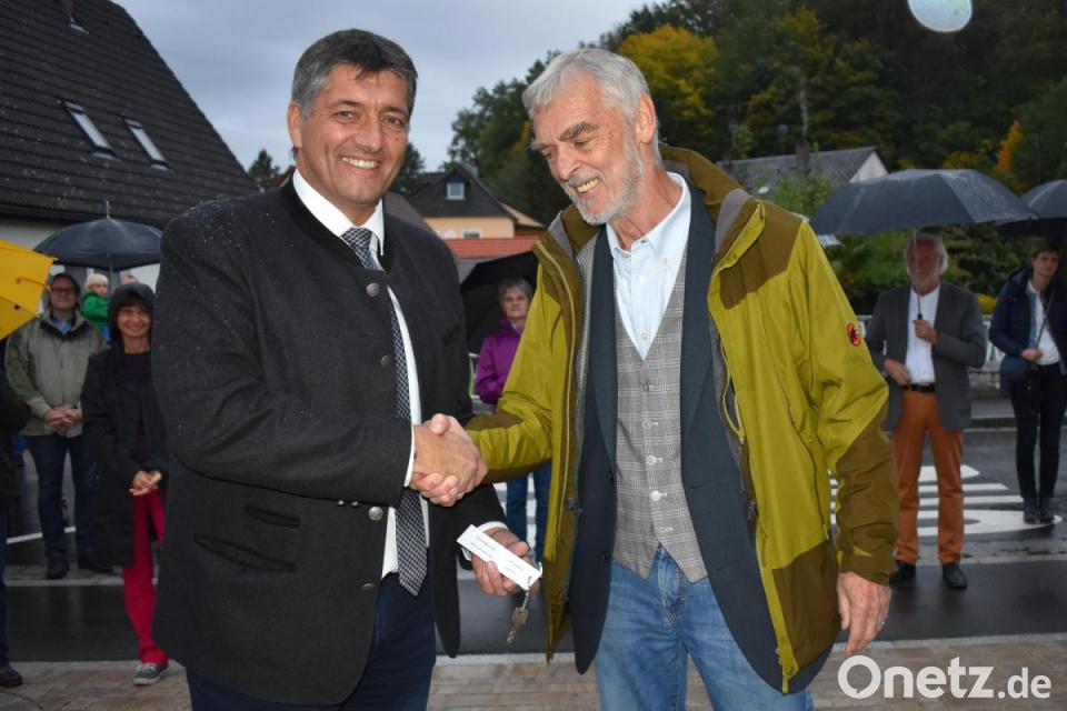 "Hütten war schon immer anders", meinte Architekt Hannes Oberndorfer. Bei der Feierstunde gab es kein Band, das durchgeschnitten wurde. In Bezug auf die Felsenkeller überreichte Oberndorfer jedoch an Bürgermeister Edgar Knobloch einen Schlüssel: Denn dort könnte Wein zum Reifen gebracht werden. Bevor die gelungene Dorferneuerung ausgiebig am neu gestalteten Festplatz beim Feuerwehrhaus gefeiert wurde, erteilte der Grafenwöhrer Stadtpfarrer Bernhard Müller dem Werk den kirchlichen Segen.