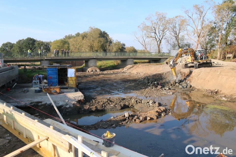Zunächst wurde das Gewässer umgeleitet. Jetzt macht es einen großen Bogen südwestlich um sein altes Flussbett. Mittlerweile ist die alte Wehranlage teilweise abgebrochen und wird abgetragen. Entstehen soll an derselben Stelle eine ähnliche Rampe aus Steinen unterschiedlicher Größen, die aber länger und damit flacher ablaufen soll.