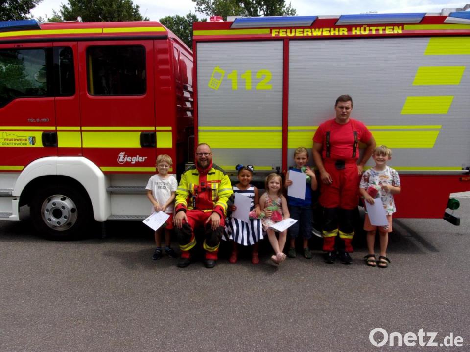 Bei einem Aktionsvormittag im Feuerwehrhaus Hütten erhielten die fünf- und sechsjährigen Vorschüler kindgerechte Einblicke in die Arbeit der Feuerwehr kombiniert mit allerlei lehrreichen und überlebenswichtigen Tipps im Zusammenhang mit Bränden und Notfällen. "Was braucht ein Feuer, um brennen zu können?", wollte ein Feuerwehrler wissen. "Feuerzeug, Wärme, Sauerstoff", sprudelte es aus den Kindern heraus. Die Kinder lernten zwischen brennbaren und nichtbrennbaren Materialien zu entscheiden und durften zusammen mit dem Feuerwehrmann mit einem Streichholz eine Kerze entzünden, um dann beides wieder fachgerecht zu löschen.