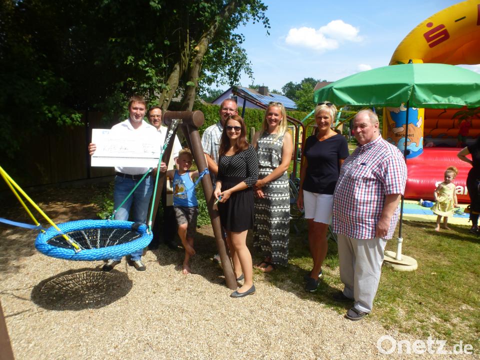 Die Verantwortlichen und Kinder strahlten mit der Sonne am Sonntag bei der Übergabe der neuen Nestschaukel für den Kinderspielplatz in Hütten um die Wette. Bei bestem Wetter wurde die neue Schaukel von Stadtpfarrer Bernhard Müller gesegnet. Er bat in seiner kurzen Andacht um den Segen Gottes, um unfallfreies Spielen und ein harmonisches Miteinander beim Benutzen des renovierten Platzes und der Spielgeräte. Anschließend durchschnitt Geschäftsstellenleiterin Simone Wolfrath von der Raiffeisenbank Grafenwöhr das blau-orange Band und gab die Nestschaukel für die Benutzung frei.