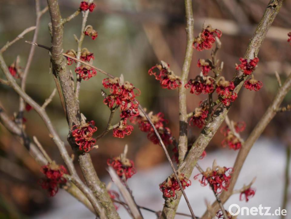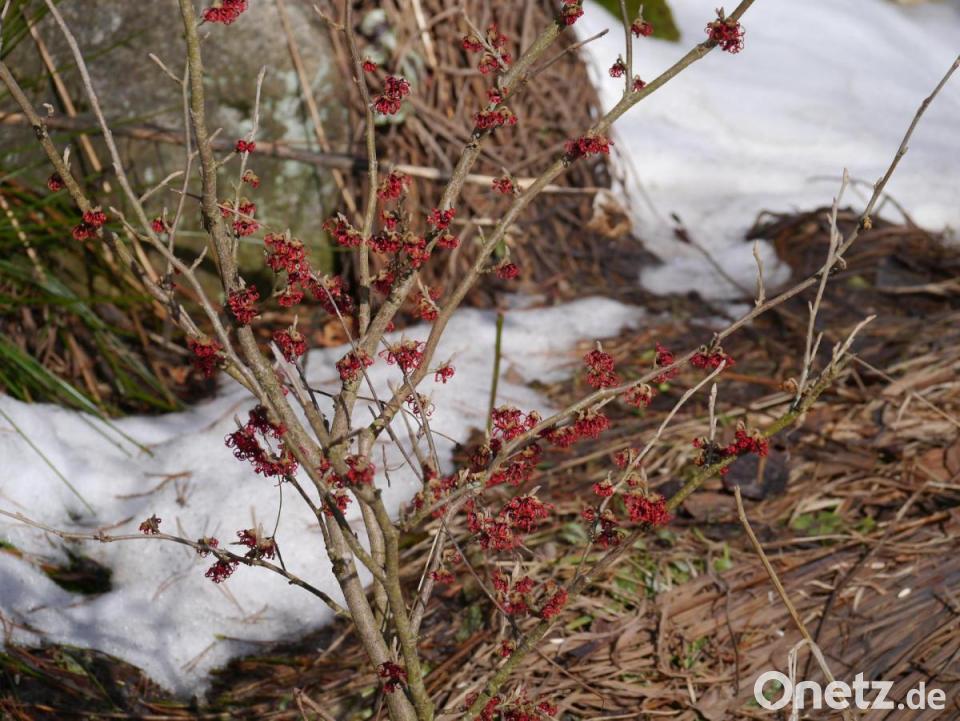 Waren ihre karminroten Blütenköpfchen in der vergangenen Woche noch mit Schnee bedeckt, so entfaltet die Zaubernuss jetzt ihre volle Blütenpracht. Nachdem der winterharte Strauch, bekannt auch unter „Hamamelis“, 20 Grad unter Null im Fichtelgebirge einfach weggesteckt hat, versprüht er jetzt seinen vollen Charme. Die frühen Blüten sind für Bienen und Hummeln eine erste wichtige Nahrung, weswegen die Zaubernuss auch gerne als Bienenweide in naturnahen Gärten gepflanzt wird. Könnte leicht sein, dass der Winter nochmals mit Schnee und Eis vorbeischaut. „Jedoch einstweilen schenkt die Zaubernuss uns diesen ersten, zarten Frühlingskuss“, schreibt Autorin Ingrid Drewing.