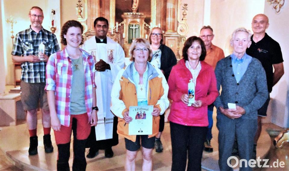 Für ihre zehnte Teilnahme bekamen Inge Bauer, Markus Riederer und Brigitte Leis eine Kerze mit dem Bildmotiv der Basilika. Zwanzig Mal sind Albert König und die über 80-jähige Hannelore Eichenseer den langen Weg gegangen. Sie erhielten einen Rosenkranz und ein Bronzekreuz. Über eine besondere Urkunde mit dem Bildmotiv der Heiligsten Dreifaltigkeit freuten sich Monika Gleißner und Elisabeth Dürgner nach ihrer 25. Wallfahrt.