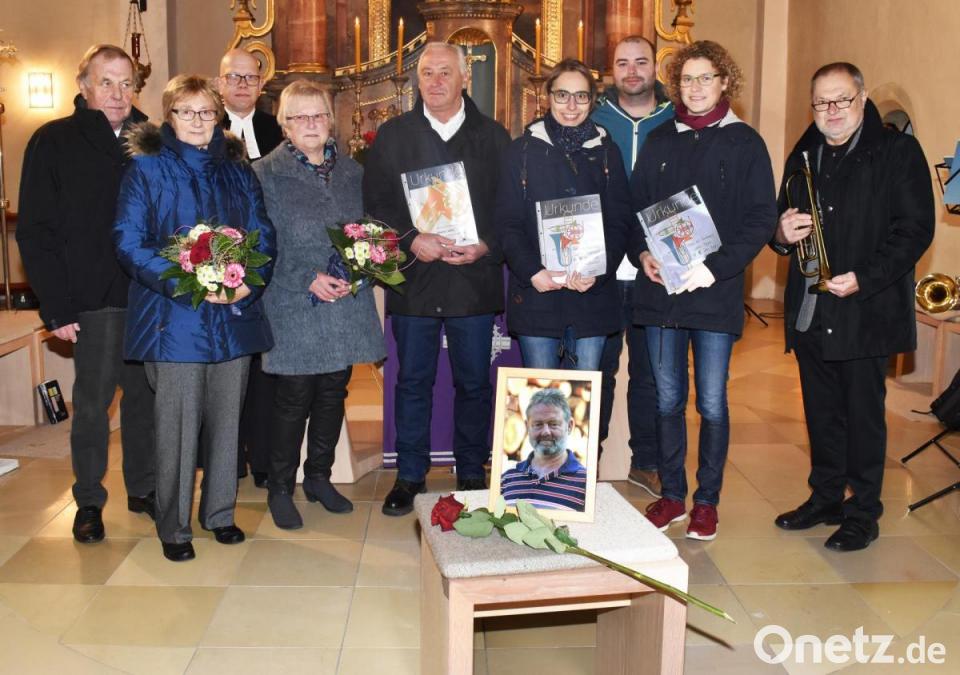 Zur Ehrung versammelt (von links): Wilhelm Kunert (40 Jahre), Erika Kunert, Pfarrer Thomas Schertel, Anni Luber, Hans Luber (50 Jahre), Barbara Prottengeier (zehn Jahre), Johannes Pirner (10 Jahre), Cornelia Dürgner (zehn Jahre) und Bezirkschorleiter Kurt Lehnerer. Im Vordergrund ein Foto der verstorbenen Wilhelm Dehling, der für 50 Jahre geehrt worden wäre.