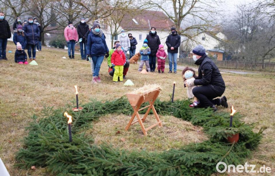 "Kommt, wir folgen dem Licht im Advent", so lautete das Thema des Familiengottesdienstes. Die Teilnehmer hatten sich zu Beginn, unter Wahrung der erforderlichen Abstände, auf dem Schulplatz eingefunden. An vier Wegstationen kamen die kleinen und großen Gottesdienstbesucher den vier Strophen des Liedes "Wir sagen euch an den lieben Advent" auf die Spur. Da es nach den geltenden Hygienevorschriften nicht gesungen werden durfte, wurde es gemeinsam gesprochen und musikalisch eingespielt. "Den Weg bereit", wie es in der ersten Strophe heißt, machte die Handpuppe "Joschi" von Jens Grahlmann in Szene gesetzt, unterstützt von Luis Kohl, indem sie symbolisch einen Berg von Hackschnitzel wegschaufelten. Dann konnte die erste Kerze, eine Fackel angezündet werden. Auf der Grünfläche des Rathauses angekommen, wurden die Familien von Linda Groß eingeladen, vorbereitete Schnüre, die an einem großen Kreuz befestigt waren, zu spannen und sich sternförmig aufzustellen. Die Verbundenheit mit Christus sollte so, trotz aller gegenwärtig geltenden aktuellen Distanz, sichtbar werden. Der Zug der Gottesdienstbesucher führte dann hinauf, mit den zwei brennenden Fackeln, in den Garten des evangelischen Gemeindehauses. Dort erzählte Carmen Grahlmann die Geschichte von "Martin, dem Schuster" - einem guten Menschen, der den Armen hilft. Als Geschenk gab es für alle eine Kerze. Mit diesen Lichtern und den mittlerweile drei Fackeln, zogen die Teilnehmer des Gottesdienstes weiter zur letzten und vierten Station, auf den Kuhberg. In einen dort mit großen Zweigen gelegten Adventskranz wurden die Fackeln gesteckt und schließlich von "Joschi" auch noch die Vierte entzündet. Die Krippe, die mitten im Adventskranz stand, war zwar noch leer, doch die Freude auf Weihnachten war sichtbar gestiegen. In seiner Predigt ging Pfarrer Thomas Schertel speziell auf die vierte Strophe des Liedes ein. Dort heißt es: "Gott selber wird kommen." Dieses Versprechen gelte auch in allen Krisenzeiten, so wie jetzt mit Corona. Er sagte: "Jesus steht an unserer Seite, still und unerkannt. Er leitet uns treu an der lieben Hand." Mit dem Kerzenlicht in der Hand und dem Licht im Herzen machten sich alle nach dem Segen gestärkt auf den Heimweg.