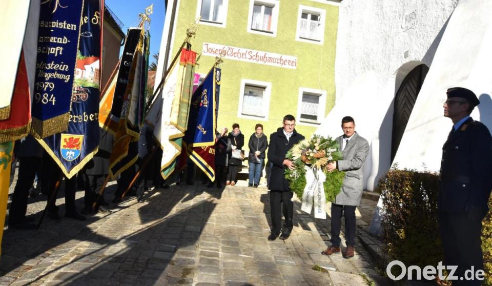 Stark machte sich der Zweite Bürgermeister für den Erhalt der Demokratie. "In einer Zeitenwende geht es darum unsere Werte mehr denn je zu vertreten und zu verteidigen." Die Gedenkfeier ist für ihn ein zeitgemäßes Zeichen für das Gute und gegen das Böse zu setzen. Der Vorsitzende der SRK Illschwang, Fritz Falk, dankte dem Posaunenchor unter der Leitung von Martin Schmidt und dem evangelischen Kirchenchor, geleitet von Julia Schmidt, für die musikalische Mitgestaltung der Feierstunde. Sein Dank galt den Familien, die sich das Jahr über um die Pflege der Kriegerdenkmäler kümmern. Die Fahnenabordnungen der Gemeinde hatten Aufstellung genommen, die SRK Illschwang stellte eine Ehrenwache. Zu den Klängen des Liedes vom guten Kameraden legten Fritz Falk und Benjamin Hiltl an beiden Denkmälern einen Kranz nieder. Dazu gab es drei Schuss Ehrensalut. In den Gottesdiensten standen bei Pfarrer Thomas Schertel in der evangelischen Kirchgemeinde sowie bei Pfarrvikar Pater Praveen in der katholischen Pfarrei Gedanken zum Volkstrauertag im Mittelpunkt.