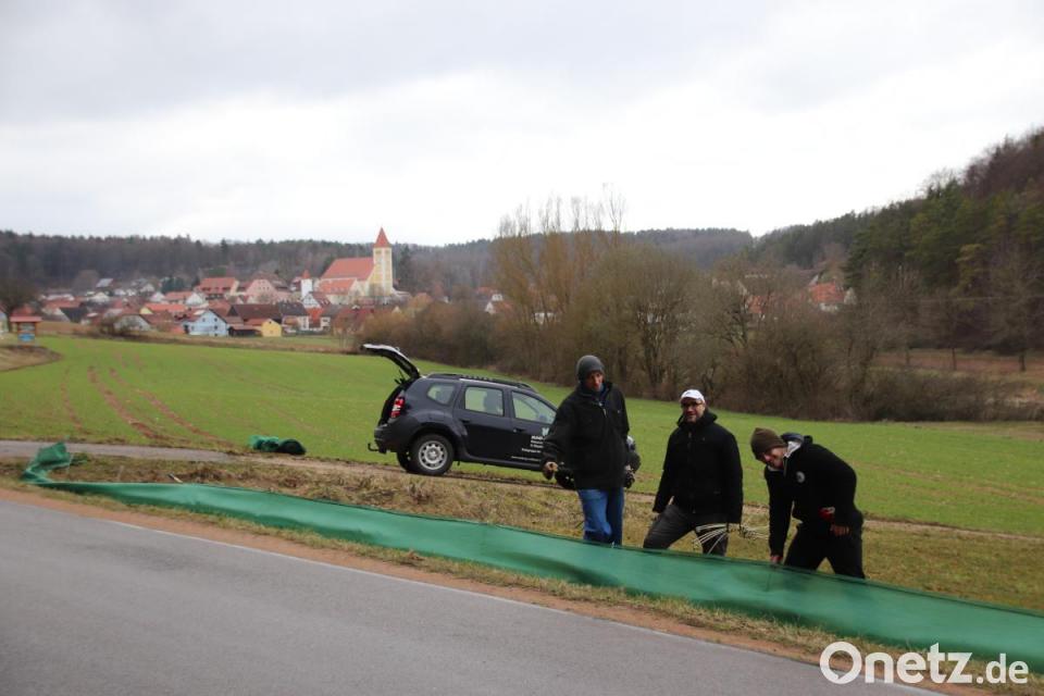 Auf der einen Straßenseite ist der Krötenzaun schon fertig. Jetzt sichern die Helfer auch die andere Seite mit einem grünen Geflecht, das mit Erdspießen im Boden verankert und dann hochgezogen wird. Für Amphibien ist das ein unüberwindbares Hindernis. Sie versuchen, am Krötenzaun vorbeizukommen und fallen schließlich in einen Eimer, der jeden Morgen geleert wird. Ein Helfer trägt dann die Tiere sicher über die Straße hinüber.