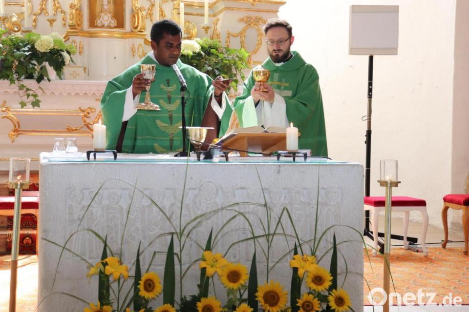 Am Ende des Gottesdienstes bedankte sich Pfarrer Arweck bei Pfarrvikar Thomas Sanikommula für zwei Jahre sehr gute Zusammenarbeit. Als Dankeschön übergab man ihm zweimal 365 Messstipendien. Ebenso bedankte sich Andrea Meier in Vertretung aller Pfarrgemeinderäte der drei Pfarreien. In seinen aufmunternden Predigten und mit seiner offenen, fröhlichen und positiven Art werde der Pfarrvikar in bester Erinnerung bleiben. Er habe es geschafft, alle mitzunehmen und für die Kirche zu begeistern. Sie wünschte ihm in seiner Heimat und bei seiner Familie alles Gute. Als kleine Erinnerung gab es einen selbstgestalteten Bildband der drei Pfarreien. Bürgermeister Stefan Braun bedankte sich ebenfalls im Namen der drei Gemeinden. Er schenkte dem Pfarrvikar ein Reagenzglas mit Oberpfälzer Luft, sollte er mal Sehnsucht haben, brauche er nur das Glas zu öffnen und einatmen. Jede Gemeinde werde auch einen Geldbetrag für das Schulprojekt in seinem Heimatdorf überweisen.