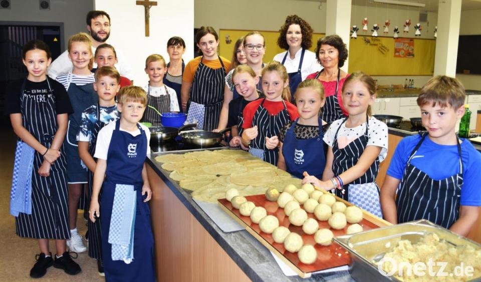 Auf der Speisekarte standen Kraftbrühe mit Pfannkuchenstreifen als Vorspeise, Schweinebraten mit Kartoffelknödel als Hauptgericht sowie Pfannkuchen mit verschiedenen Toppings zum Dessert. Seinen Kochkurs für das Ferienprogramm organisierte der CSU-Ortsverband Illschwang erneut in Zusammenarbeit mit dem Landhotel Weißes Ross. Zum mittlerweile sechsten Mal kamen Katharina und Christian Fleischmann in die Schulküche. Edeltraud Koller und Edeltraud Pickel standen ihnen, wie schon von Anfang an, zur Seite; zum ersten Mal unterstützte sie Julia Dirler. Mit 14 Teilnehmern war der Kochkurs voll belegt. Unter den Mädchen und Buben war auch Stammkundschaft: Sechs von ihnen fehlten bisher kein einziges Mal. Ihnen gefällt sowohl die lustige Atmosphäre als auch das Dazulernen bei ihren Kochfähigkeiten. Einige Kinder helfen zu Hause gerne der Mama in der Küche. Eine neue Erfahrung ist es für sie auch, Rezepte in die Praxis umzusetzen. Ausgerüstet mit einer Schürze des Weißen Rosses, waren alle mit Begeisterung bei der Sache. Während der Schweinebraten in der Bratröhre stand, unternahmen die Kinder mit Katharina Fleischmann einen Rundgang durch das Landhotel. Dabei warfen sie einen Blick in die Küche und den Wellnessbereich. Zurück in der Schulküche, ließen sich alle das gemeinsam zubereitete Menü schmecken. Dabei wurden auch schon Wünsche geäußert, was im nächsten Jahr beim Kinderkochkurs auf den Tisch kommen soll. Als Favoriten kristallisierten sich Spagetti Bolognese, Gartensalate mit selbst angemachten Dressing sowie Creme brulée heraus.