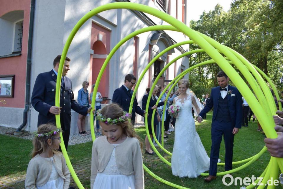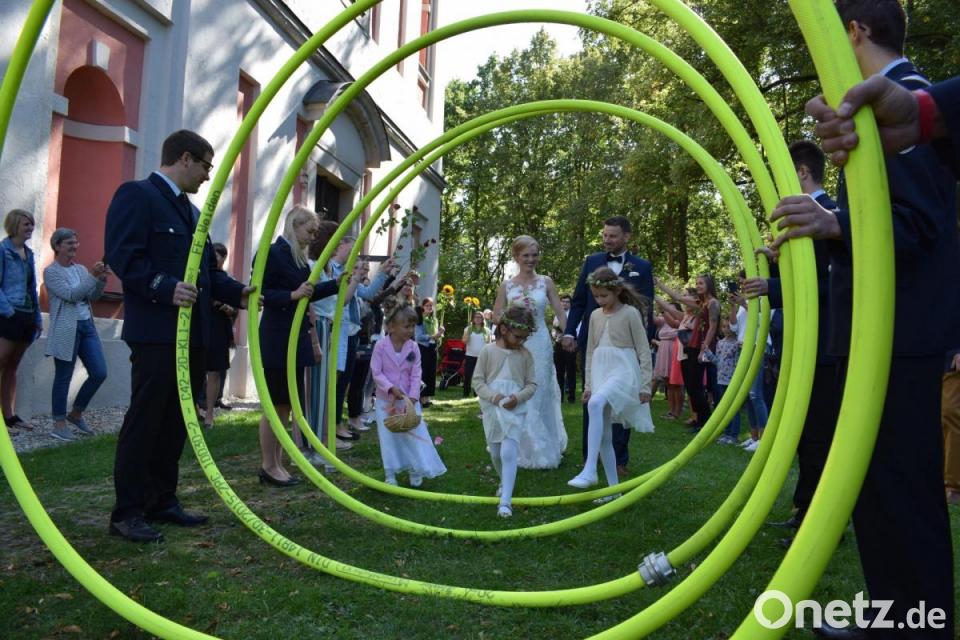 Nach dem das Brautpaar den Schlauchspalier durchschritten hatte, ging es mit der Drehleiter in die Luft. In 30 Metern Höhe gab es ein Küsschen in trauter Zweisamkeit und einen weiten Panoramablick über die Heimat der Braut, sogar das gemeinsame Haus in Rotzendorf, in dem die beiden seit fast einem Jahr wohnen, konnten die Frischvermählten von oben sehen. Seit vier Jahren sind die 34-jährige Arzthelferin und der 35-jährige Maschinenbauingenieur ein Paar. Kennengelernt hatten sie sich auf einer Geburtstagsfeier von Freunden. Bereits 2019 stand die standesamtliche Trauung an. Die Hochzeitsfeier fand anschließend in einer festlich geschmückten Festhalle in Rotzendorf statt.