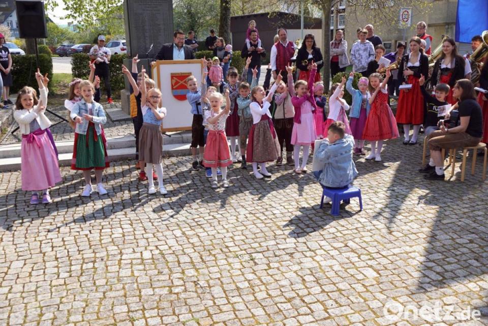 „Wir sind gut drauf – und ihr?“ Diese Frage stellten die Schüler der Kombiklasse 1/2b nach ihrem Auftritt bei der Maifeier der Gemeinde den rund 250 Teilnehmern. Den Wonnemonat in seinen bunten Facetten hatten die Schüler beschrieben. Zuvor verriet die Gruppe des Kindergartens volkstänzerisch, dass es zum Abendessen Rehragout geben würde. Die beiden mit viel Applaus belohnten Darbietungen leitete die Kemnather Stadtkapelle mit dem Marsch „Mein Heimatland“ ein, und der Sängerbund ergänzte mit „Das Lied mein Band“. Bürgermeister Thomas Kaufmann beleuchtete in seiner Ansprache die kulturelle und geschichtliche Bedeutung des 1. Mai als Wonnemonat und als Tag der Arbeit.