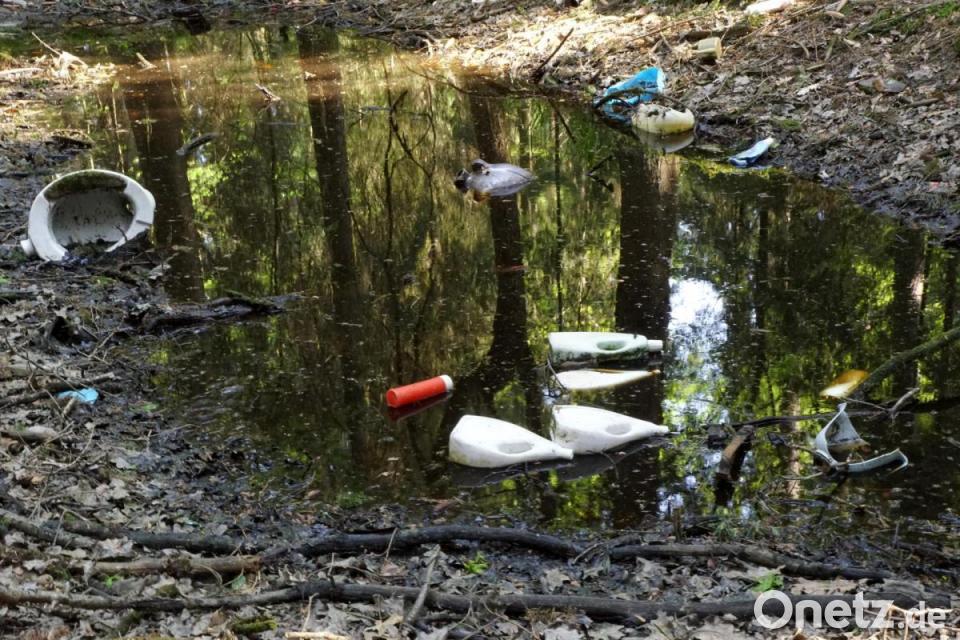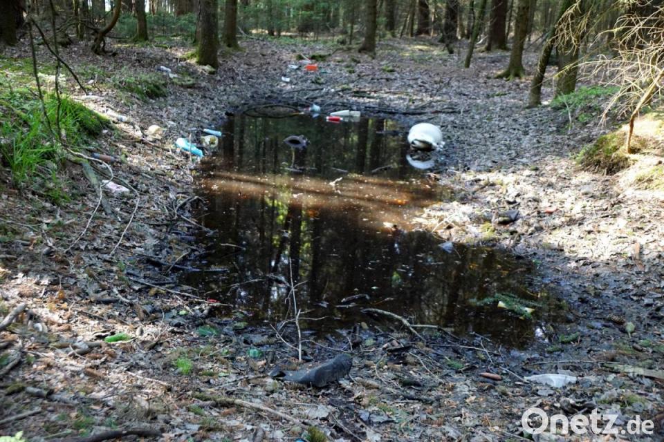 Plastikflaschen statt Enten schwimmen auf einem kleinen Tümpel im Wald. Fehlender Niederschlag ließ den Wasserspiegel sinken und verrät, dass unter dem Laub und den Nadeln der Bäume noch einiges versteckt ist. Bauschutt und weiterer Müll werden sichtbar. Im Wasserschutzgebiet, zwischen dem Tiefbrunnen der Gemeinde und der Kreisstraße TIR 27, hat sich die illegale Mülllagerstätte angesiedelt. Ein Wanderer hat die Müllhalde entdeckt.