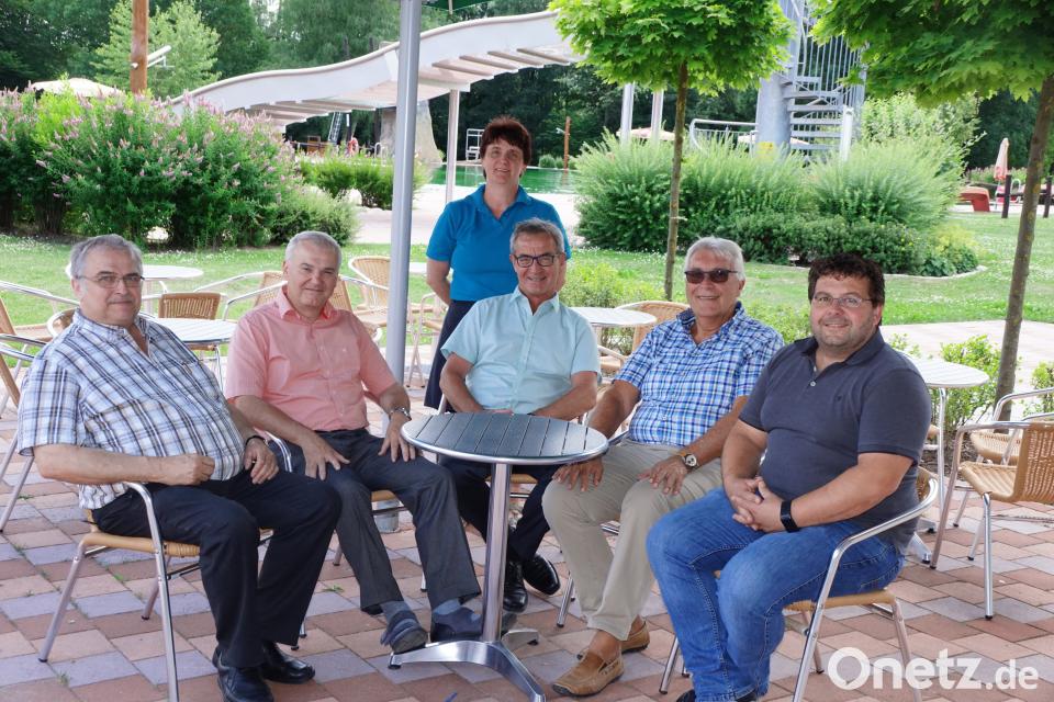 Unter dem schattigen Schirm gefällt es auch den drei Oberpfälzer Bürgermeistern des Naturerlebnisbades: Bruno Busch (von links), Bürgermeister Günter Kopp (Kulmain), Petra Wöhrl, Kemnaths Bürgermeister Werner Nickl, amtierender Bürgermeister von Immenreuth Josef Hecht und Thomas Kaufmann von der Gemeindeverwaltung Immenreuth..